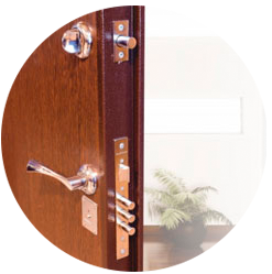 В замковую систему наших дверей входят: основной цилиндровый замок, дополнительный сувальдный замок, ночная задвижка, врезная броненакладка, защищающая дверь от взлома при попытке сверления, расширения или выбивания корпуса замка.